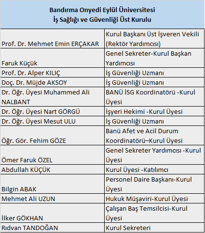 Üst kurul başkanı Rektör / Rektör Yardımcısı'dır. Sekretarya ise İş Sağlığı ve Güvenliği Koordinatörü tarafından yürütülür.